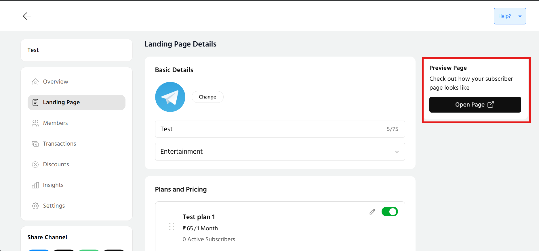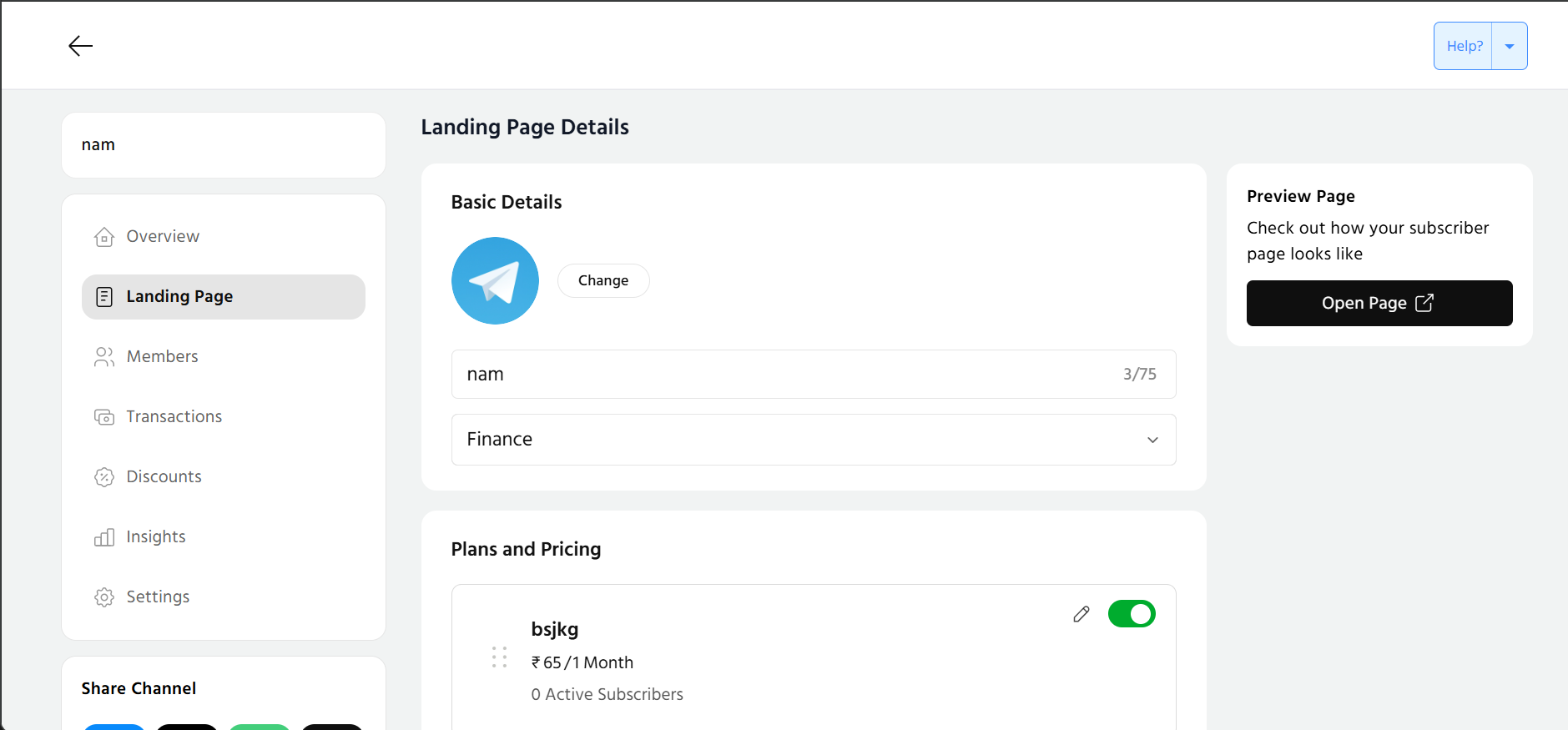 Under the Telegram Channel Dashboard, click on "Landing Page Tab".