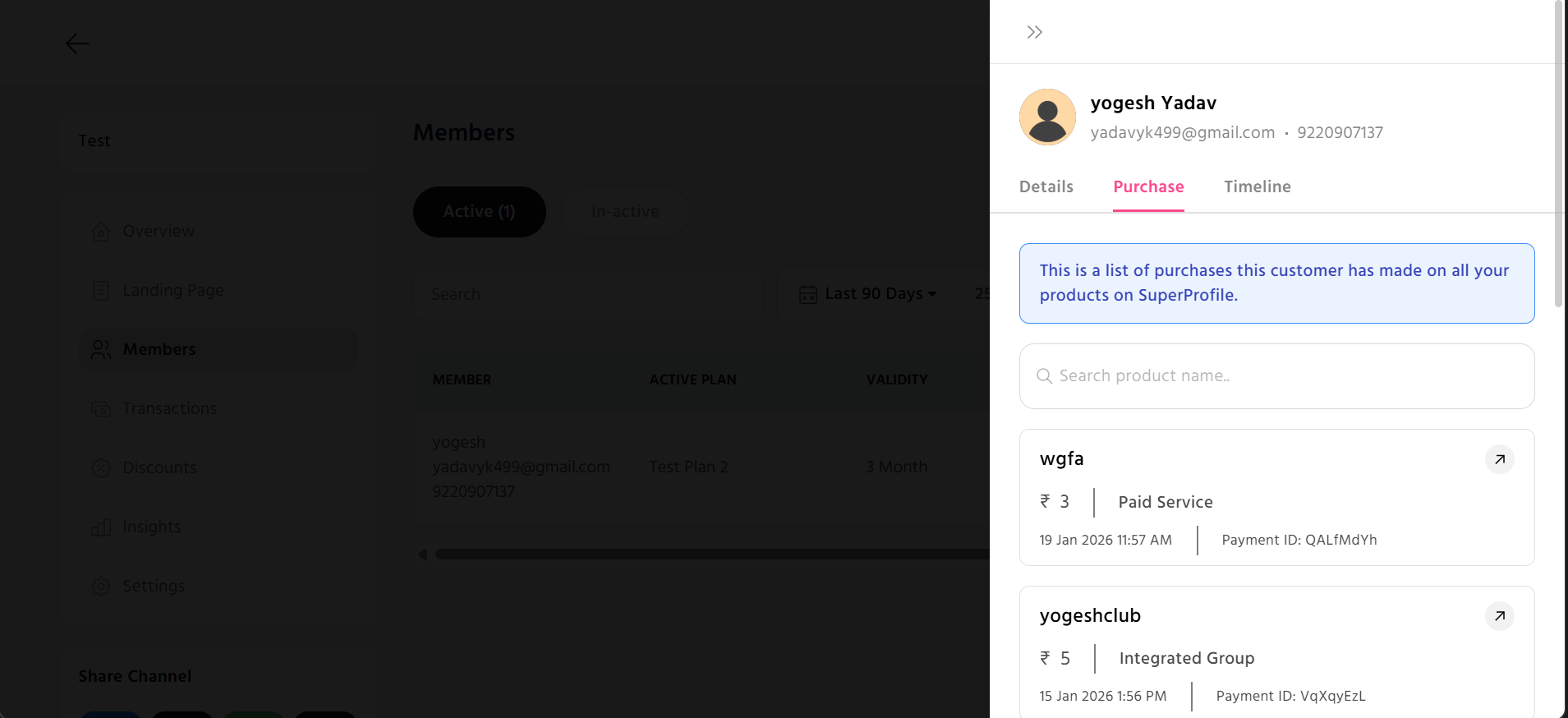 Click on the Purchase tab if you want to know about the purchases this customer has made on all your products on cosmofeed.