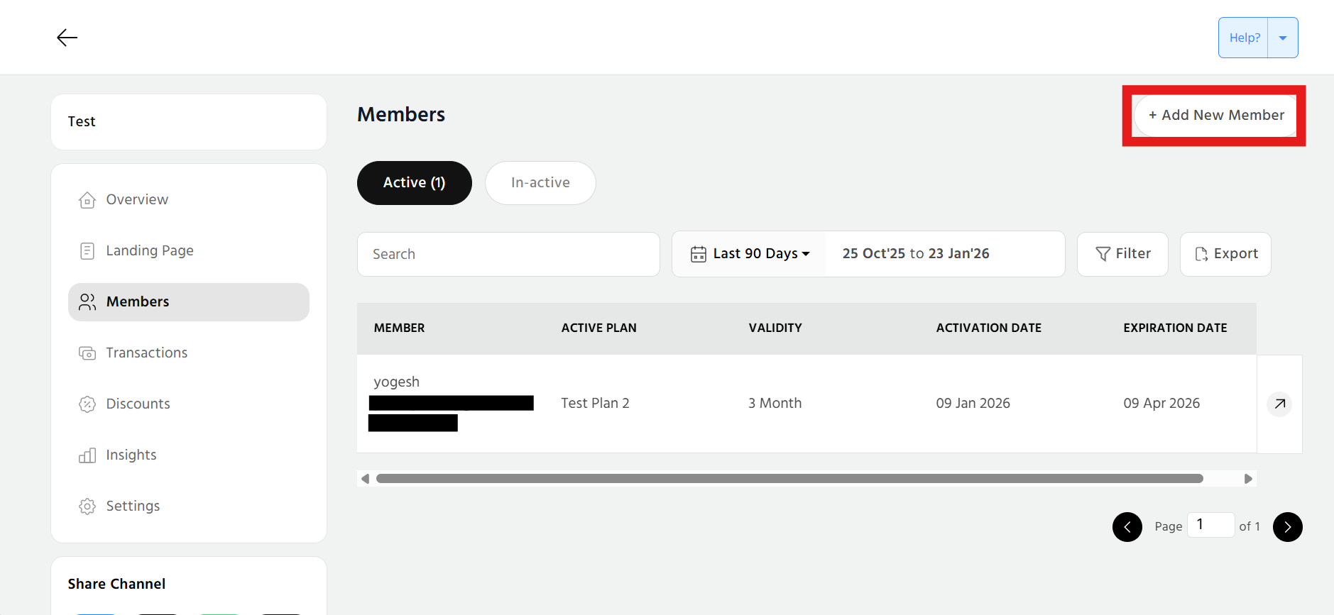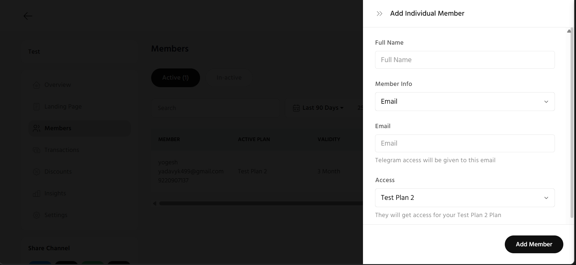 To add a new member, fill the details of the member, like name, email address, phone number. You can even choose and select the plan to give access to the member, it can be for days, weeks, months, etc.