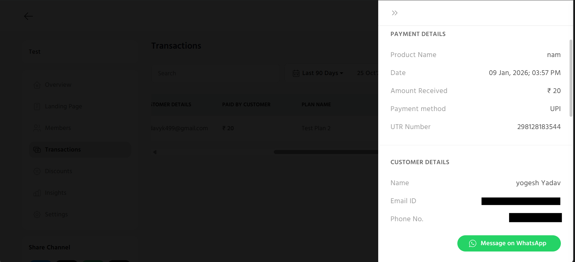 You can view the all the details here like payment details, customer details and you can also directly message the customer by clicking on the "WhatsApp" icon.